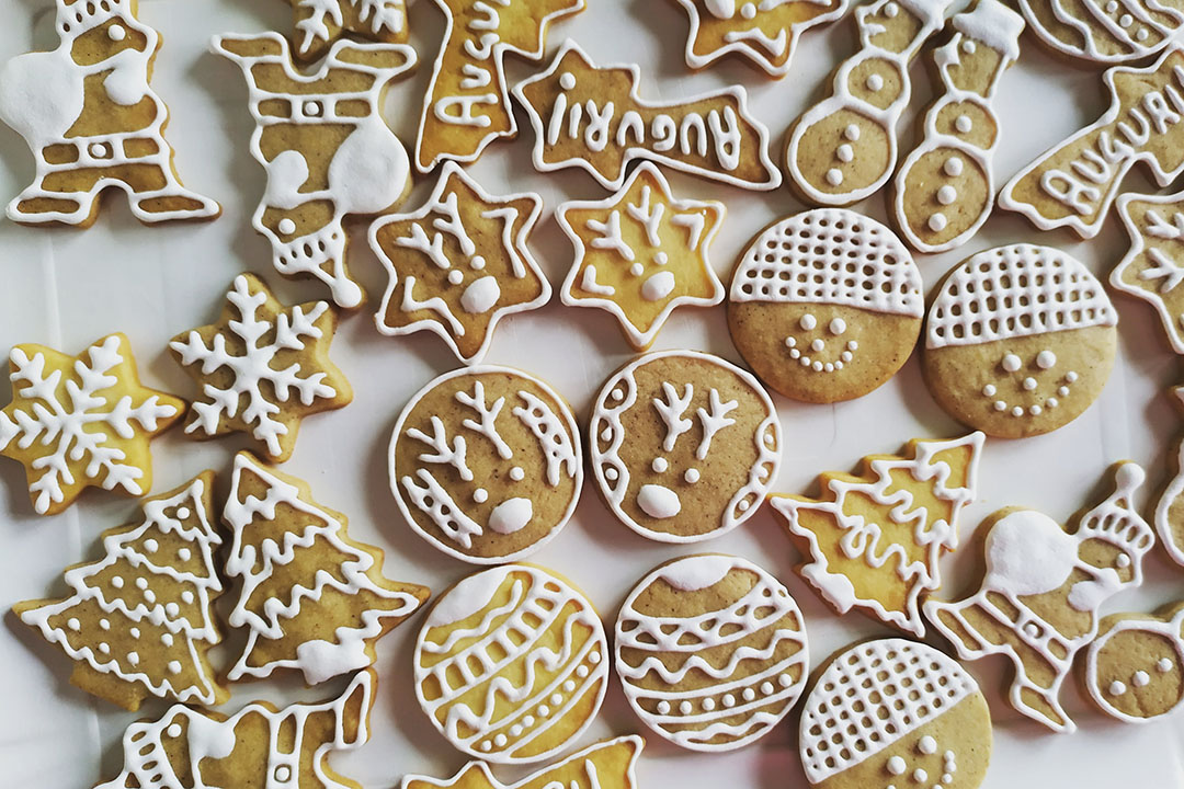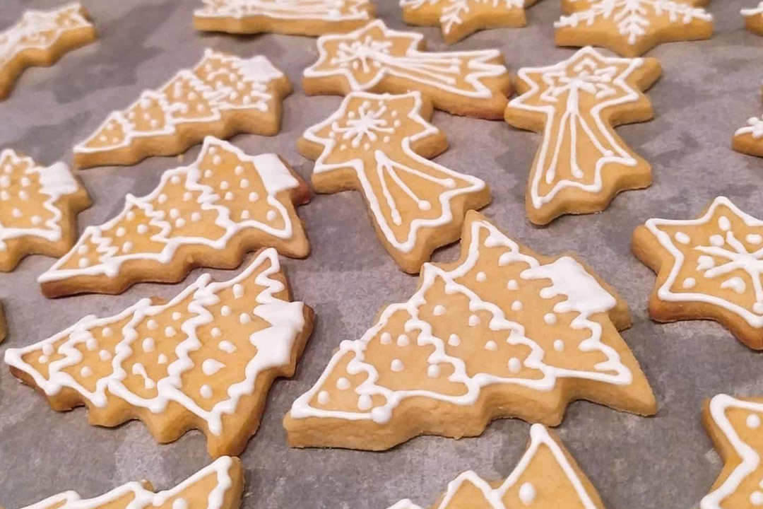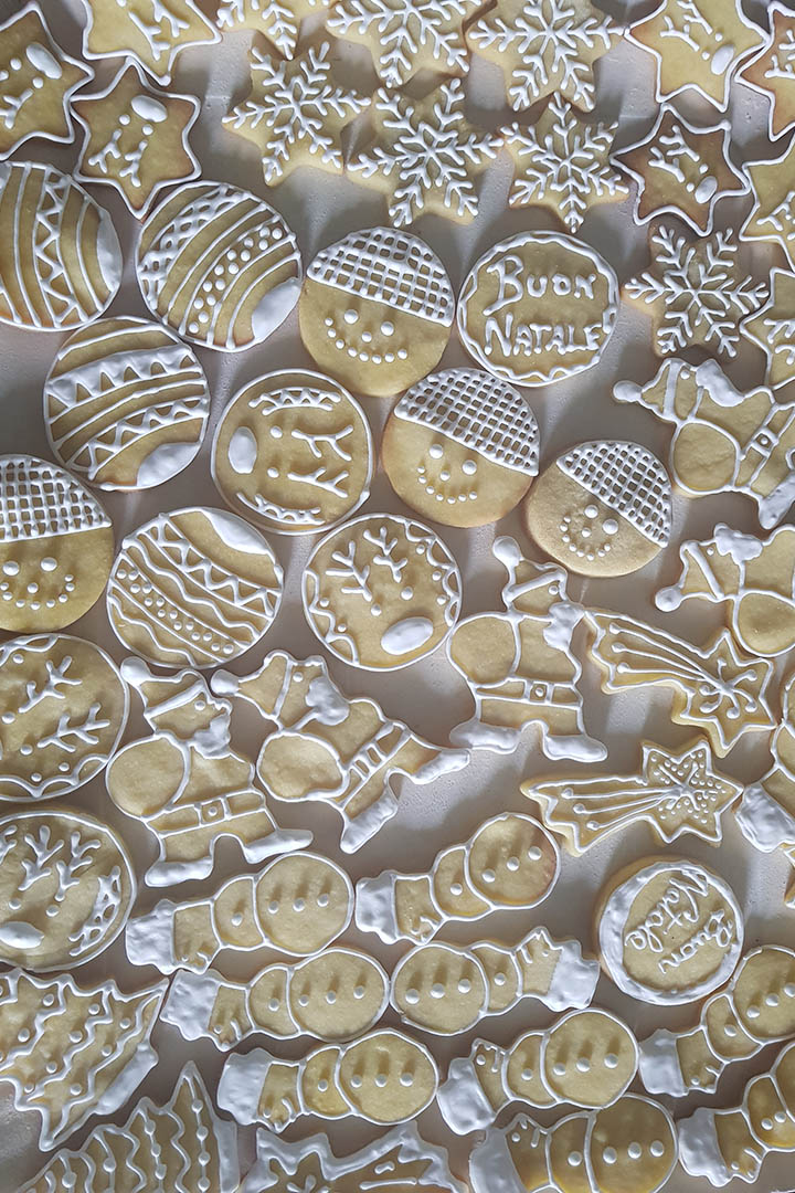 Biscotti di pasta frolla decorati con ghiaccia reale bianca o colorata a tema Natalizio, anche con frolla al cacao.