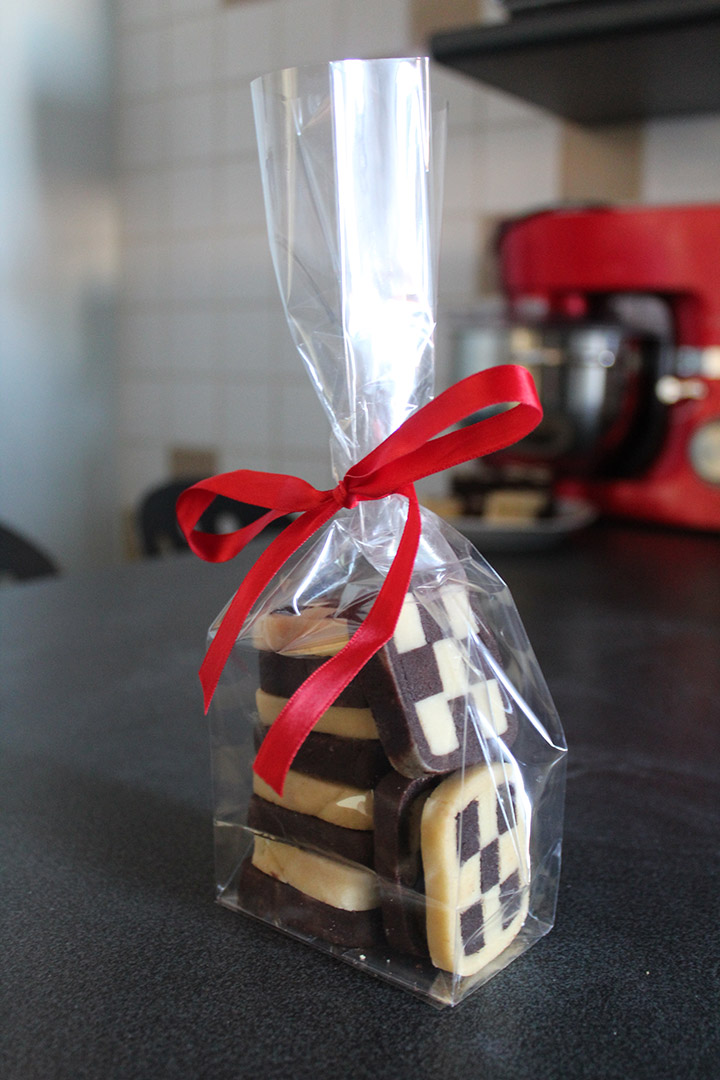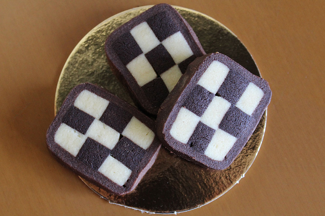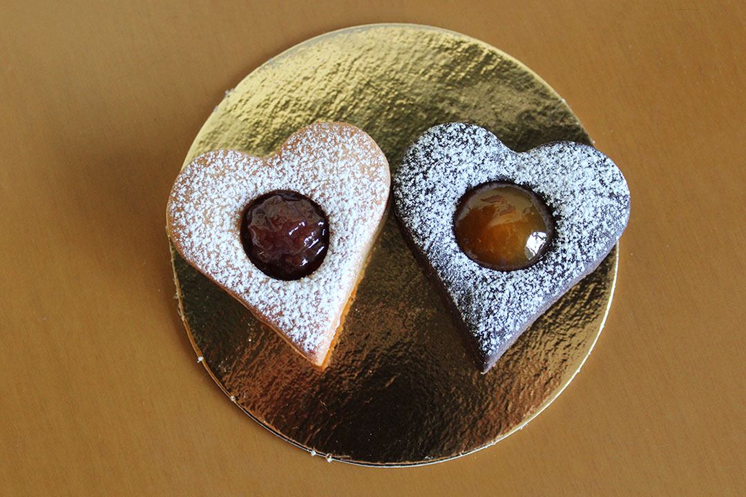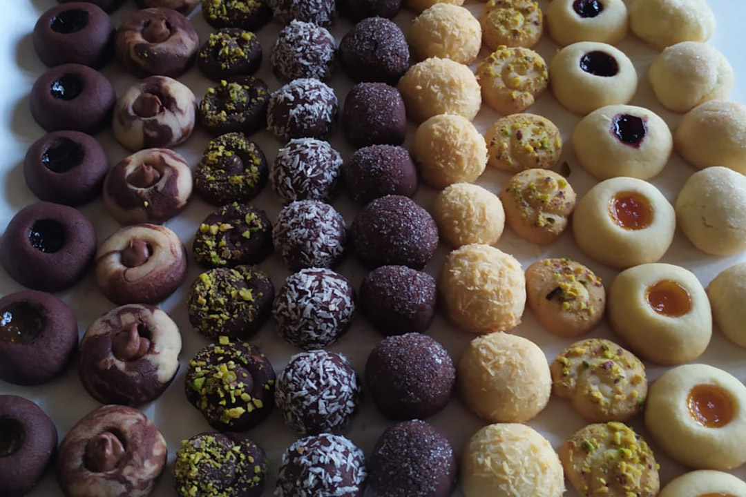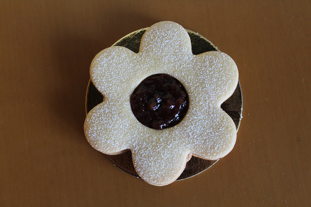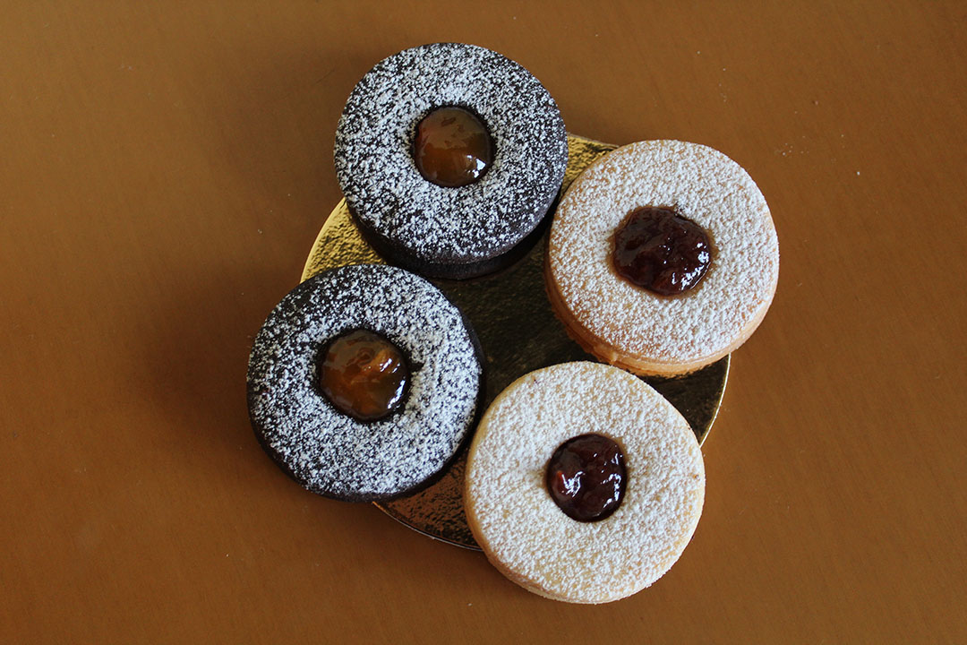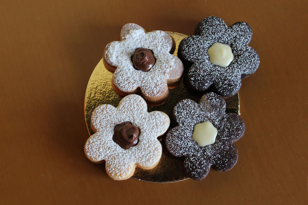 Biscotti di pasta frolla bianca e al cacao con granelle di frutta a guscio e cocco o ripieni di marmellata e cioccolato.