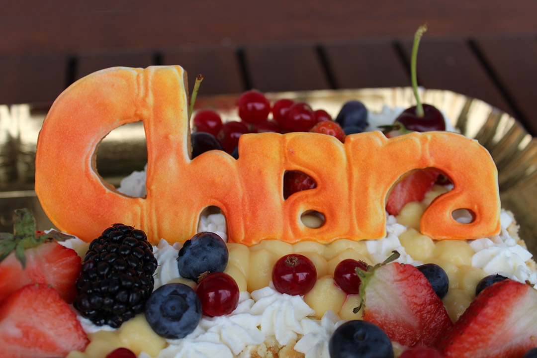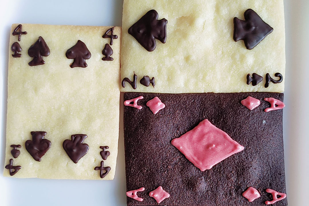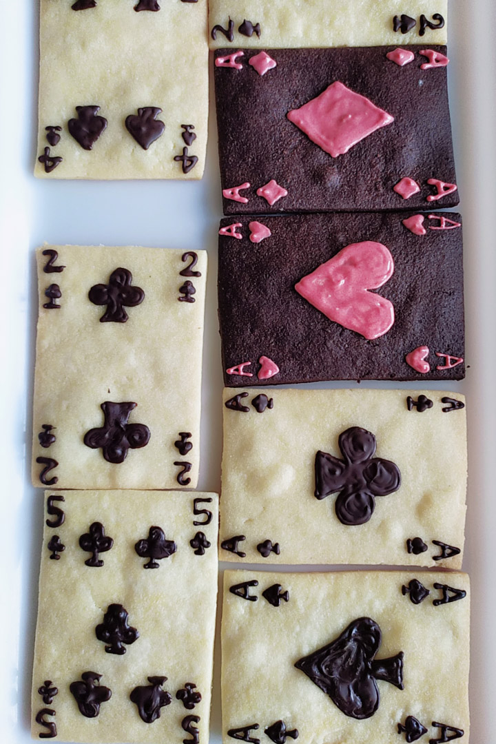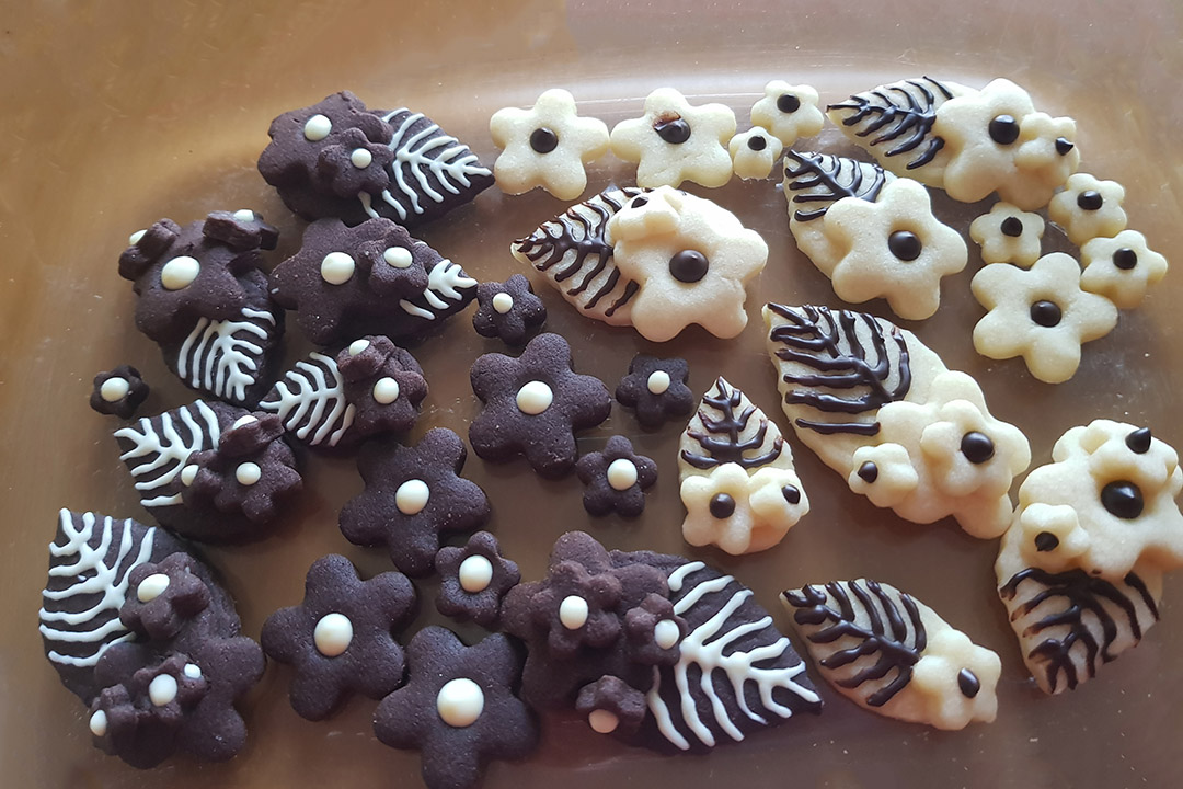 INGREDIENTI: pasta frolla (farina, burro, zucchero, uova, cacao), albume, zucchero, limone, colorante alimentare, cioccolato fondente, cioccolato bianco.